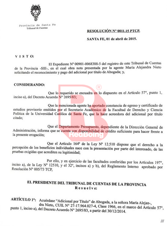 La historia de la mencionada Alejandra Nieto en el TCP es realmente muy particular: esposa de Biagioni, ingresó al organismo después de haber sido durante toda su vida laboral secretaria administrativa (llevar expediente, cargar los expedientes al sistema interno, dar entradas y salida a un trámite). En el organismo fue secretaria privada de uno de los vocales, el abogado Gerardo Gasparrini. Y ella se recibe como abogada en 2014 en la Universidad Católica de la capital provincial.