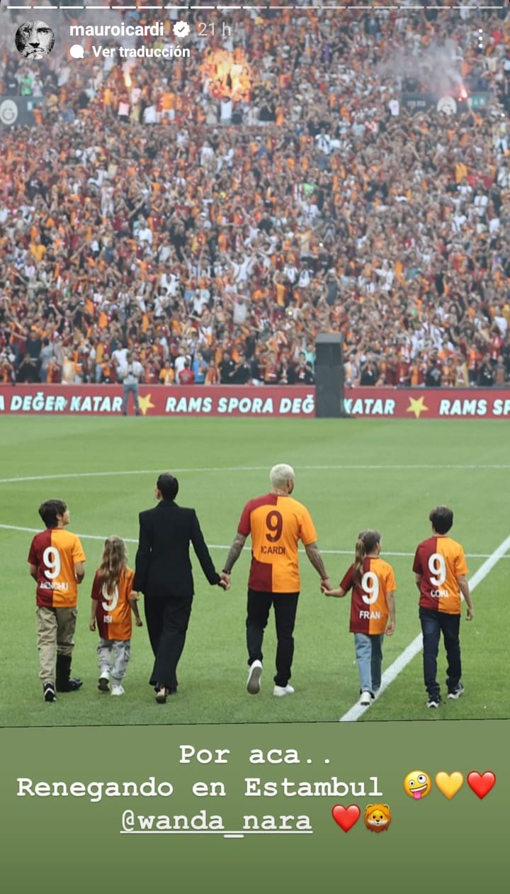 El futbolista argentino estuvo rápido para responder a la chicana y subió esta foto a su historia en lo que fue su espectacular recibimiento y presentación en el Galtasaray de Turquía: “Por aca.. Renegando en Estambul” titulaba la frase Mauro y etiquetaba a su esposa acompañándolo.