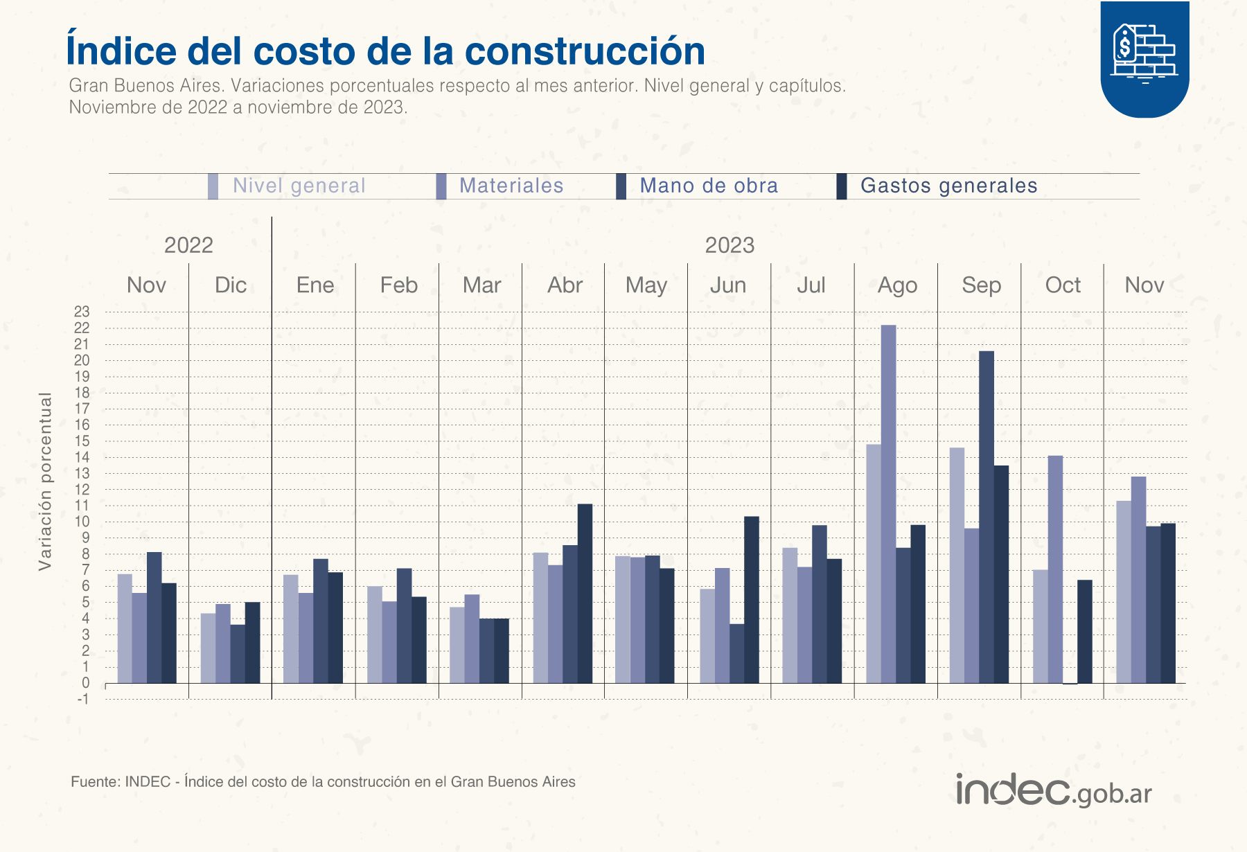 En cuanto al costo de la construcción, en noviembre se verificó un alza del 12,8% en Materiales; 9,7% en la mano de obra; y 9,9% en los Gastos Generales. Los mayores aumentos entre los materiales se registraron en Mesadas de Granito, con el 32,7%; Artefactos de gas, 24,5%; Pinturas y afines, con el 17,9%; ascensores, 16,7%; Ladrillos y otros productos cerámicos, 15,5%, entre otros.