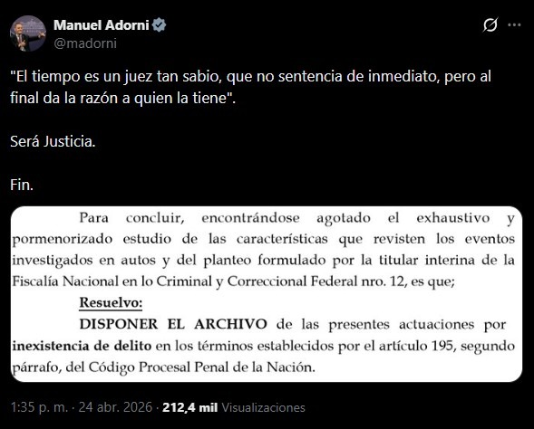 La resolución se alineó con el criterio de la fiscal Alejandra Mángano, quien concluyó que la presencia de Angeletti, esposa de Adorni, en el avión presidencial, no configuró un delito penal. La clave del fallo radica en la inexistencia de un “daño patrimonial” para el Estado: el avión oficial contaba con plazas vacantes y la habitación de hotel en Nueva York tenía una tarifa fija doble, por lo que la estadía no generó costos adicionales. “El tiempo es un juez tan sabio que al final da la razón a quien la tiene. Fin”, celebró el funcionario en su cuenta de X apenas se conoció la noticia.