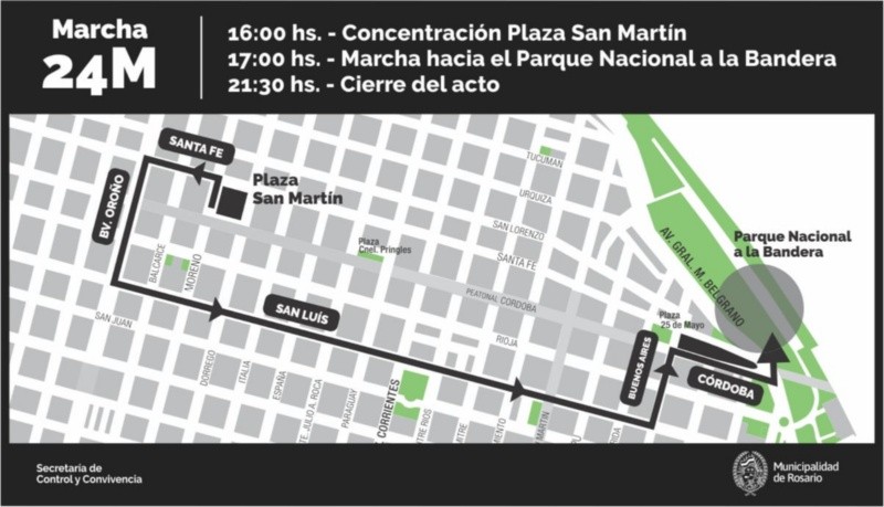 La movilización partió desde la Plaza San Martín, donde el tránsito se vio interrumpido. Continuó por calle Santa Fe, para tomar luego Bv. Oroño, San Luis, Buenos Aires, Córdoba y llegada al Monumento Nacional a la Bandera. A las 21:30 horas se realizó el cierre del acto.