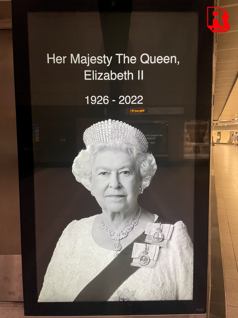 Sí es cierto que ciudad está llena de carteles con la imagen de la Reina en blanco y negro, en la que tiene una banda negra y con la leyenda “Her majesty, the Queen, Elizabeth II. 1926- 2022”. Esta imagen es oficial y está en cada estación de metro y subtes, en negocios (aunque algunos tienen la propia ) y en carteles luminosos en distintos puntos.