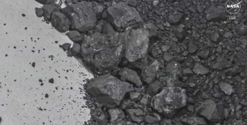 La foto mostraba un grupo de rocas y polvo color carbón que habían quedado en la parte exterior del conjunto de recolección de muestras cuando el suelo del asteroide fue succionado a través de un filtro hacia el recipiente de almacenamiento.