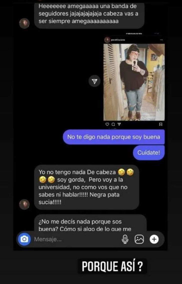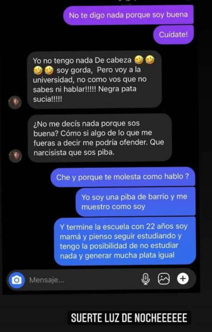 La joven compartió en sus historias de Instagram el diálogo que mantuvo con una usuaria, “Luz de Noche”, quien le dijo: “Cabeza vas a ser siempre amegaaaaaaaaaa” y le respondió “no te digo nada porque soy buena. ¡Cuidate!”.