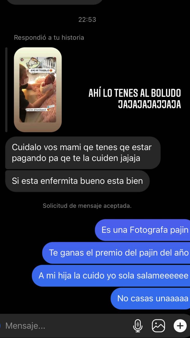 Además, subió otra captura de un mensaje de otro usuario que cuestionaba su manera de maternar. “Cuidala vos mami, que tenés que estar pagando para que te la cuiden”, le dijo y ella aclaró que la mujer que estaba con su hija en la foto era una fotografa.