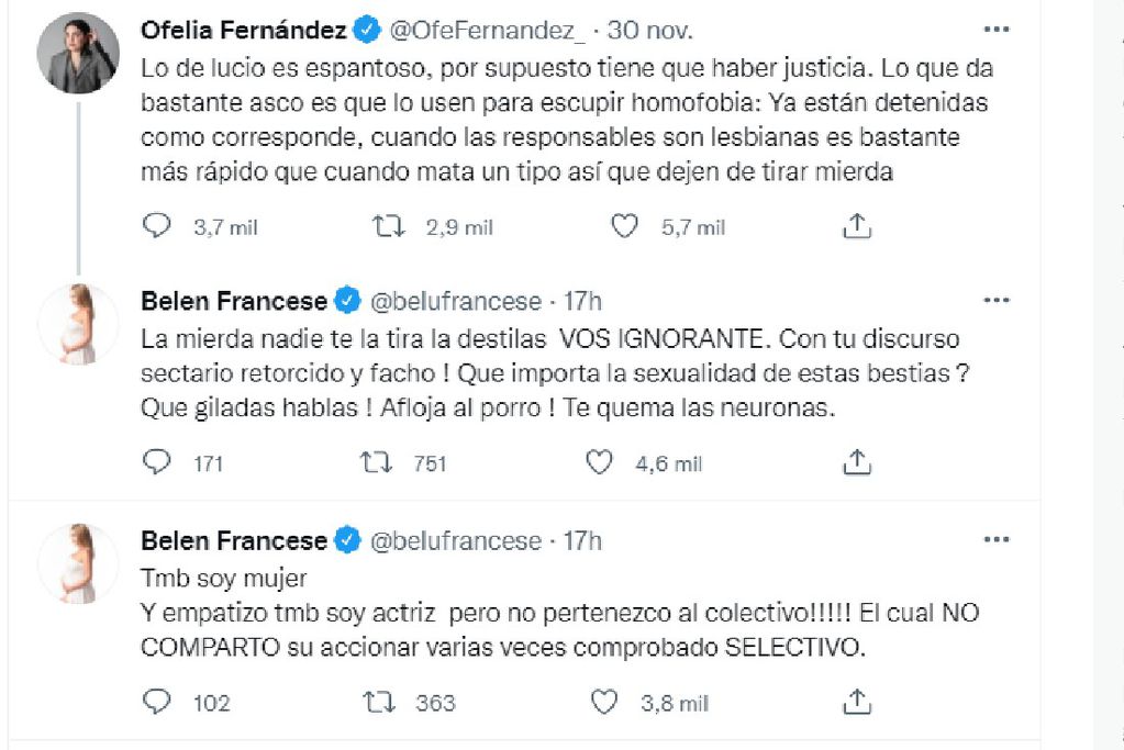 Los mensajes de Ofelia no tardaron en provocar reacciones varias, entre ellas las de Belén Francese, que se mostró indignada. “La mierda nadie te la tira, la destilas vos, ignorante, con tu discurso sectario retorcido y facho. ¿Qué importa la sexualidad de estas bestias? ¿Que giladas hablas? ¡Afloja al porro! Te quema las neuronas”, fue la respuesta de Belén.