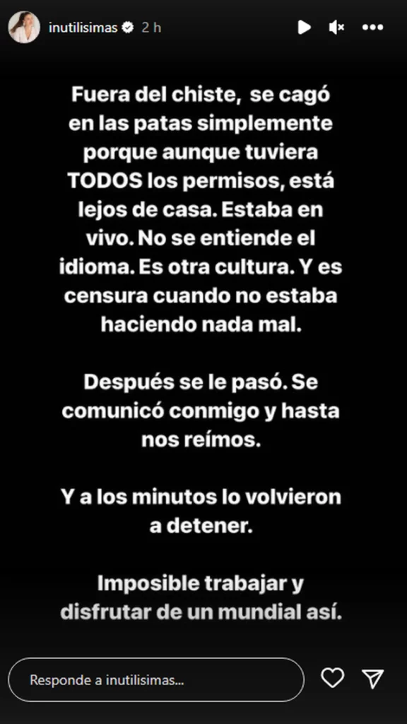 Más tarde, la esposa del periodista que fue censurado en Qatar publicó en su cuenta de Instagram un mensaje para llevar tranquilidad después del incidente, aunque explicando que había sido un momento de temor: “Fuera de chiste, se cagó en las patas simplemente porque aunque tuviera todos los permisos, está fuera de casa, estaba en vivo, no se entiende el idioma, es otra cultura y es censura cuando no estaba haciendo nada mal. Después se le pasó, se comunicó conmigo y hasta nos reímos y a los minutos lo volvieron a detener, imposible trabajar y disfrutar un Mundial así”.