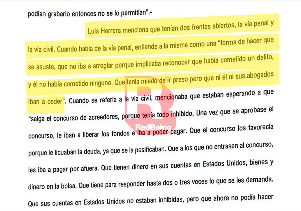 Enseguida, Herrera proponía una estrategia de pago planteando dos acciones diferentes para la vía civil y la penal del litigio. Así lo explica una de las personas damnificadas en el documento al que accedió RedBoing: “Cuando habla de la vía penal, entiende a la misma como una forma de hacer que se asuste, que no iba a arreglar porque implicaba reconocer que había cometido un delito, y él no había cometido ninguno. Que tenía miedo de ir preso pero que ni él ni sus abogados iban a ceder. Cuando se refería a la vía civil, mencionaba que estaban esperando a que salga el concurso de acreedores, porque tenía todo inhibido. Una vez que se aprobase el concurso, le iban a liberar los fondos e iba a poder pagar. Que el concurso los favorecía porque le licuaban la deuda, ya que se la pesificaban. Que a los que no entrasen al concurso, concurso, le iban a liberar los fondos e iba a poder pagar. Que el concurso los favorecía porque le licuaban la deuda, ya que se la pesificaban. Que a los que no entrasen al concurso, les iba a pagar por afuera. Que tienen dinero en sus cuentas en Estados Unidos, bienes y A dinero en la bolsa. Que tiene para responder hasta dos o tres veces lo que se les demanda. Que sus cuentas en Estados Unidos no estaban inhibidas, pero que ahora no podía hacer una transferencia en el exterior porque él era el titular y si se destapan esos movimientos lo podían culpar de que le enviaba dinero a un tercero para ocultarlo y que el abogado no se lo permitía. Mencionaba constantemente que tenía un grupo de gente aliada, que por un sistema de puntos iban a cobrar en el concurso y también por fuera del mismo”.