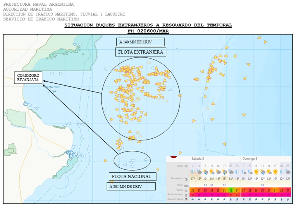 La Prefectura Naval Argentina monitorea el ingreso de manera controlada de más de 250 buques chinos que buscan refugiarse en la Zona Económica Exclusiva. El ingreso se debe a las malas condiciones hidrometeorológicas que se esperan para las próximas horas y por ello, los buques podrán ingresar al lugar, de manera controlada sin realizar actividad de pesca.