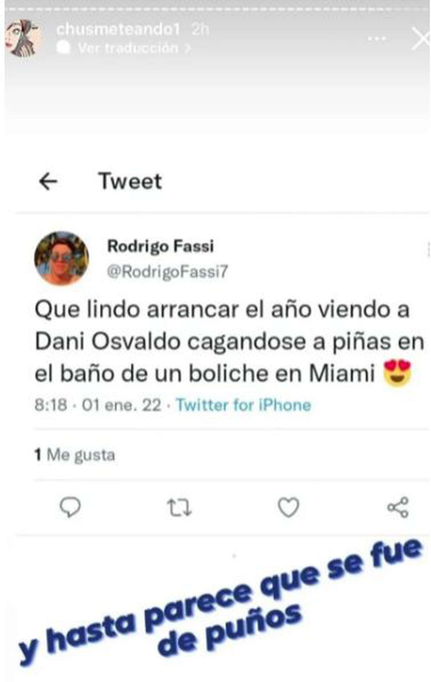 Incluso en Twitter un usuario contó que había visto a Osvaldo peleando en una fiesta. “Qué lindo arrancar el año viendo a Dani Osvaldo cagándose a piñas en el baño de un boliche de Miami”, escribió @RodrigoFassi7.