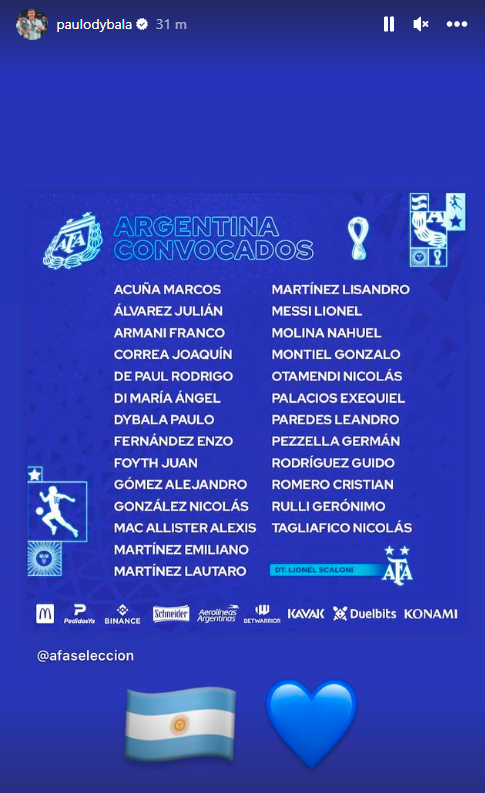 Luego, los jugadores compartieron la lista en sus historias. Paulo Dybala, uno de ellos, agregó un corazón azul y una bandera de Argentina. Previamente había posteado un mensaje de su novia, Oriana Sabatini que decía: “Que incréible ver como tu esfuerzo y sacrificio dio sus tan merecidísimos frutos. Te amo y no puedo esperar para verte en la cancha representando la más linda”.