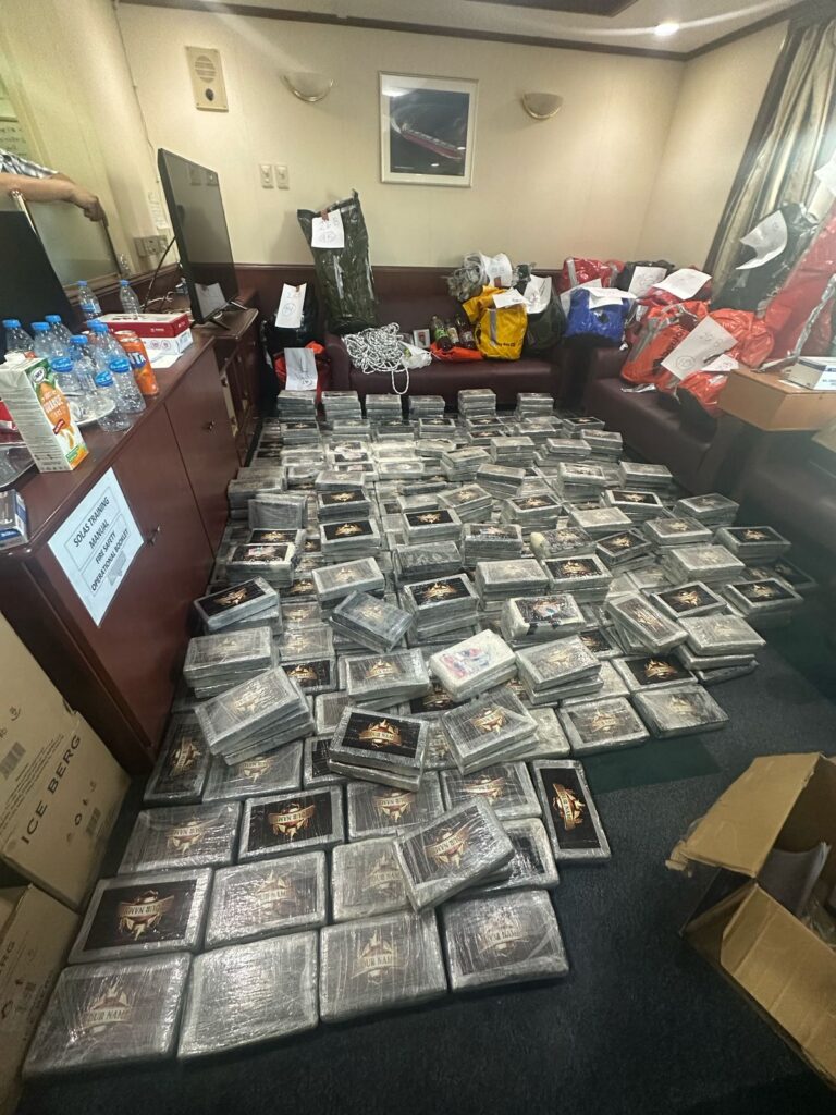 Durante el procedimiento, fueron encontrados 15 bultos con panes de cocaína escondidos en bolsos estancos dentro de los refrigeradores de la nave. Cada uno estaba cuidadosamente empaquetado con materiales impermeables, lo que indicaría una preparación para ser arrojados al agua y luego recuperados, utilizando flotadores, boyas y rastreadores satelitales también hallados en el lugar.