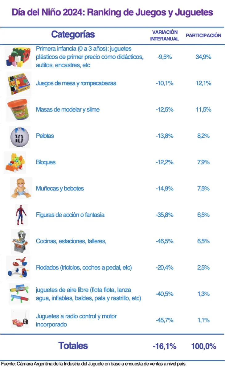 La Cámara Argentina de la Industria del Juguete (CAIJ) emitió un comunicado este sábado en la previa del Día del Niño, donde lamentó una caída del 16% en el total de las ventas de juegos y juguetes. Por otra parte, el dato positivo fue en relación al comercio electrónico, que mostró un crecimiento del 10%, aunque sólo explica el 20% del total de las ventas en la actualidad.