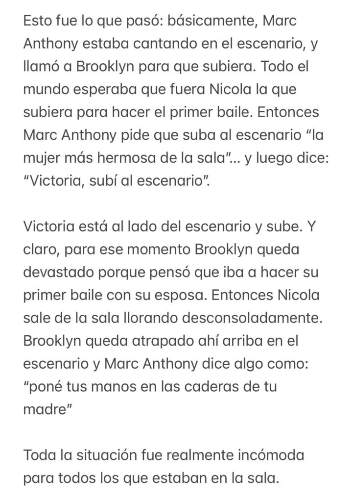 “Marc Anthony estaba actuando en el escenario y llamó a Brooklyn. Todo el mundo esperaba que Nicola subiera para hacer el primer baile”, relató. Sin embargo, el cantante sorprendió a los invitados al pedir que se acercara “la mujer más hermosa de la sala”, lo que muchos interpretaron como una referencia a la novia. “Entonces dijo: ‘Victoria, subí al escenario’. En ese instante, Brooklyn quedó devastado”, explicó Fat Tony.