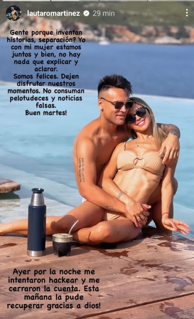 Finalizado el partido en República Checa, reabrió su cuenta y publicó como story una foto con su mujer, acompañado del siguiente texto: “Gente, por qué inventan historias de separación. Yo con mi mujer estamos juntos y bien, no hay nada que aclarar. Somos felices. Dejen de consumir pelotudeces y noticias falsas”.