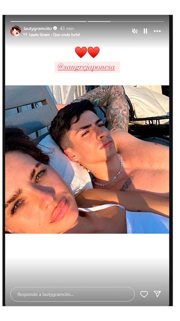 Para darle fuerza a este mensaje, en el que por primera vez se los ve juntos y en este mood de romance, Lauty Gram arrobó a la también cantante y le agregó dos emojis de corazones rojos.