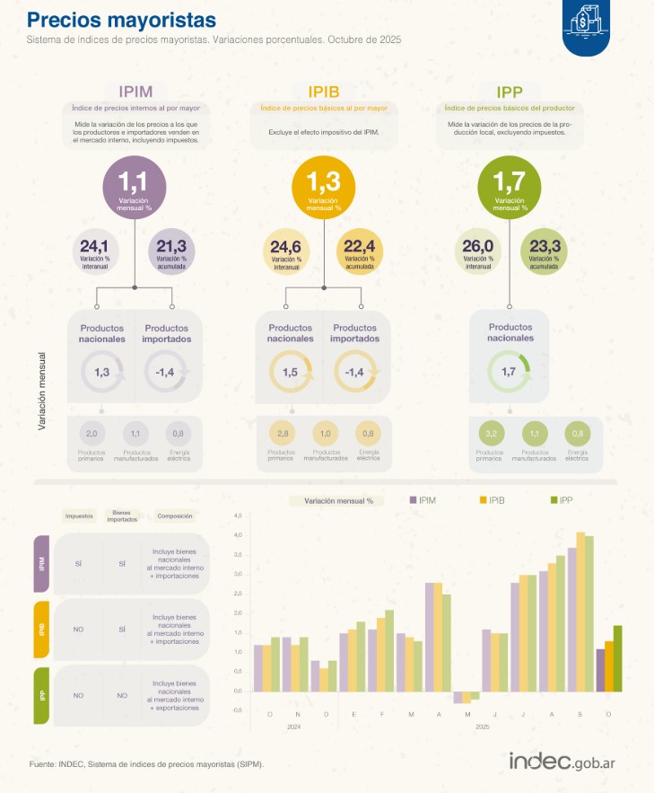 El Instituto Nacional de Estadística y Censos (Indec) informó que el Índice de Precios Internos al por Mayor (IPIM) registró en octubre de 2025 un aumento del 1,1%, impulsado principalmente por las subas en los productos nacionales, que crecieron 1,3%, mientras que los importados mostraron una baja del 1,4%.