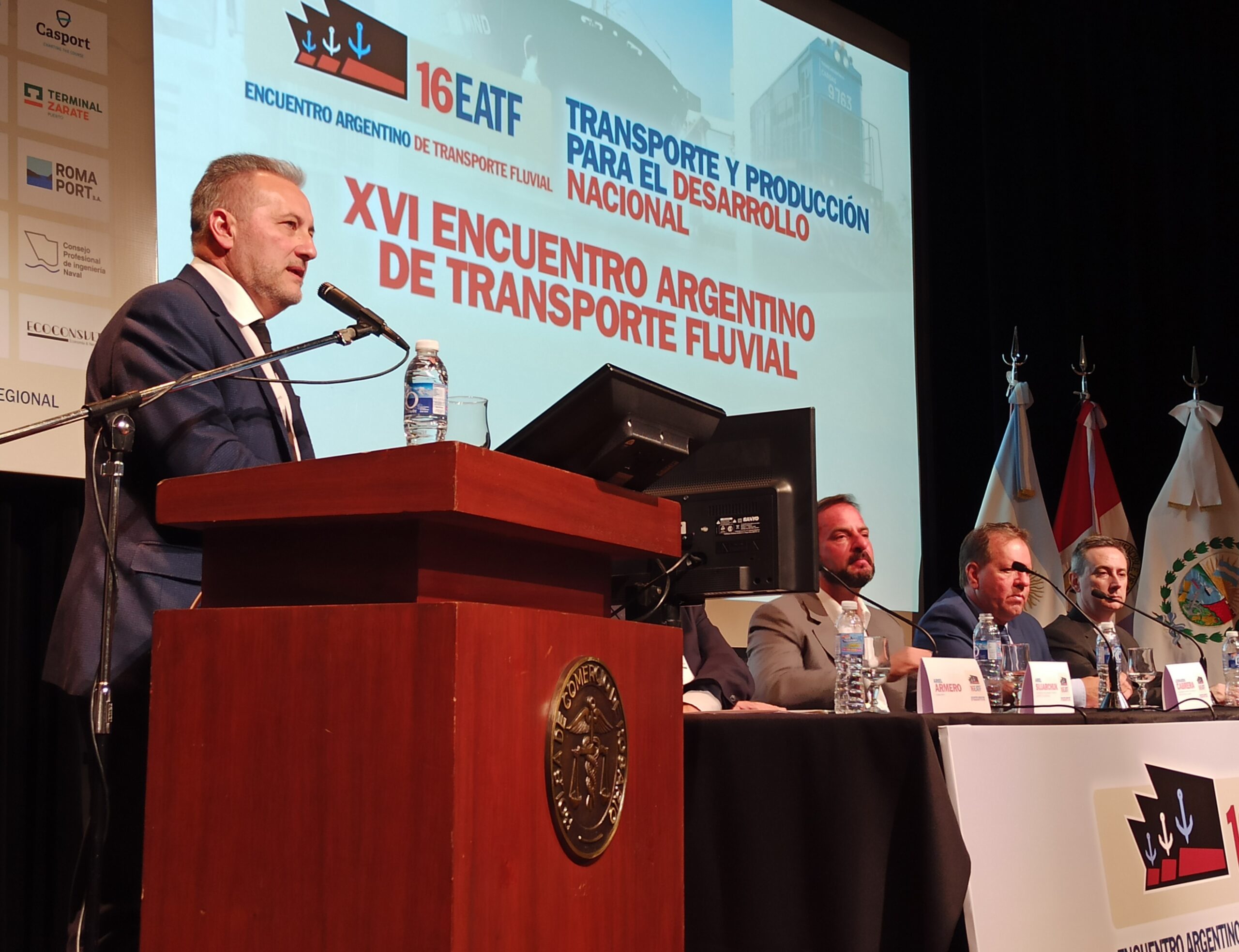 El senador nacional por Santa Fe, Marcelo Lewandowski, participó del XVI Encuentro Argentino de Transporte Fluvial, que se lleva a cabo en el auditorio de la Bolsa de Comercio de Rosario. Estuvieron entre otros, el Secretario de Transporte de la Nación, Diego Giuliano; el Interventor de la Administración General de Puertos, José Beni; el Presidente del Ente Nacional de Control y Gestión de la Vía Navegable, Ariel Sujarchuk; y el Presidente de la Bolsa de Comercio de Rosario, Miguel Simioni.