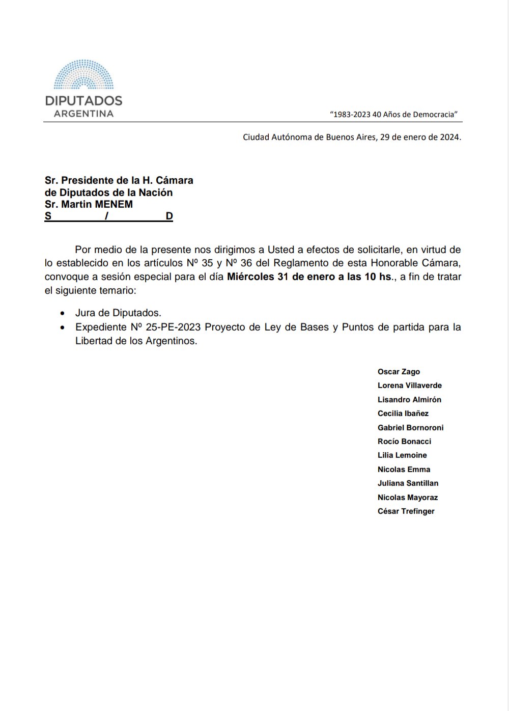 En el temario, consta la jura de diputados y luego el tratamiento del expediente correspondiente al proyecto del Ejecutivo sobre Bases y Puntos de Partida para la Libertad de los Argentinos.