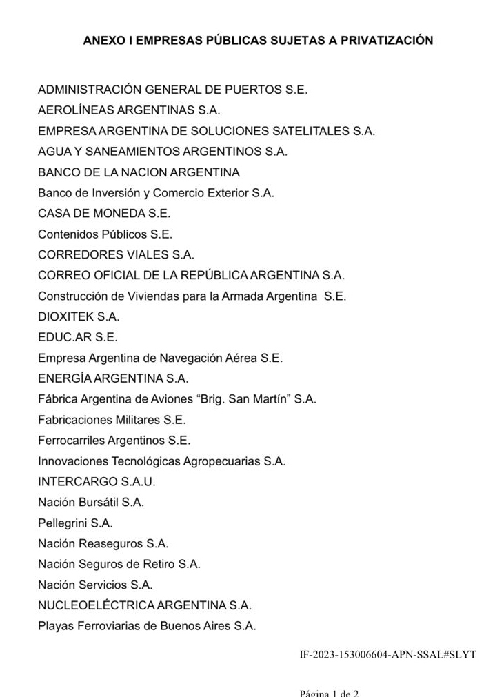 El anexo donde se encuentran las empresas sujetas a privatizar se inicia con la Administración General de Puertos y sigue con Aerolíneas Argentinas, la Empresa Argentina de Soluciones Satelitales, Agua y Saneamiento, Banco Nación de la Argentina, Banco de Inversión y Comercio Exterior, Casa de la Moneda, Contenidos Públicos, Corredores Viales y el Correo Oficial de la República Argentina.