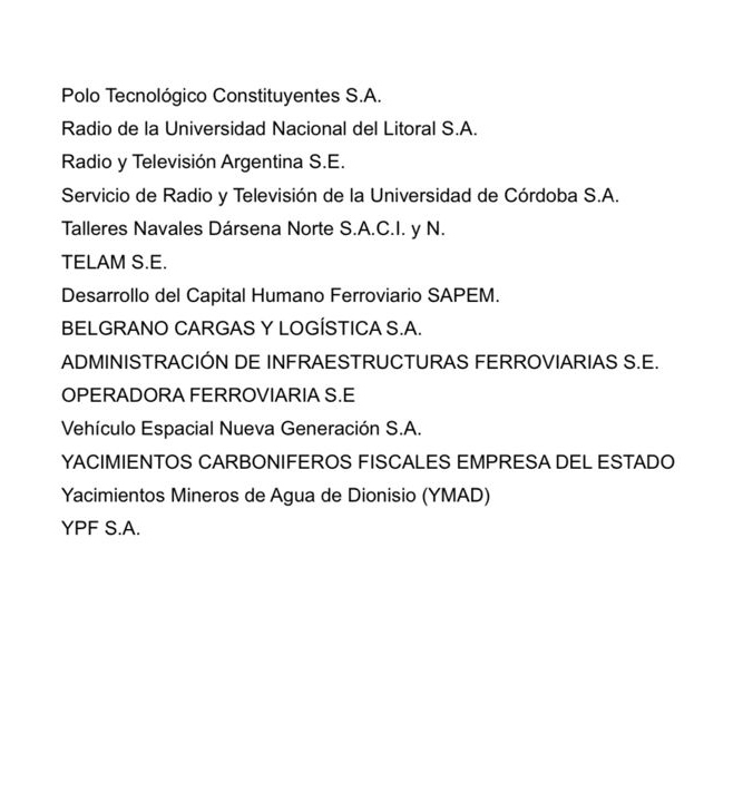 Servicio de Radio y Televisión de la Universidad de Córdoba, Talleres Navales Dársena Norte, Telam, Desarrollo del Capital Humano Ferroviario, Belgrano Cargas y Logística, Administración de Infraestructuras Ferroviarias, Operadora Ferroviaria, Vehículo Espacial Nueva Generación, Yacimientos Carboníferos Fiscales, Yacimientos Mineros de Agua de Dionisio (YMAD) e YPF..