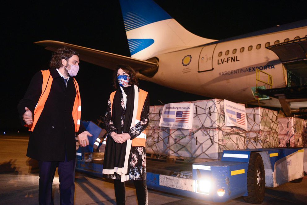 Los dos vuelos de Aerolíneas Argentinas que transportaban las 3,5 millones de vacunas Moderna donadas por Estados Unidos llegaron al país el viernes por la noche. El cargamento fue recibido en persona por el jefe de Gabinete, Santiago Cafiero, y por la encargada de Negocios de la Embajada de Estados Unidos en Argentina, MaryKay Carlson.