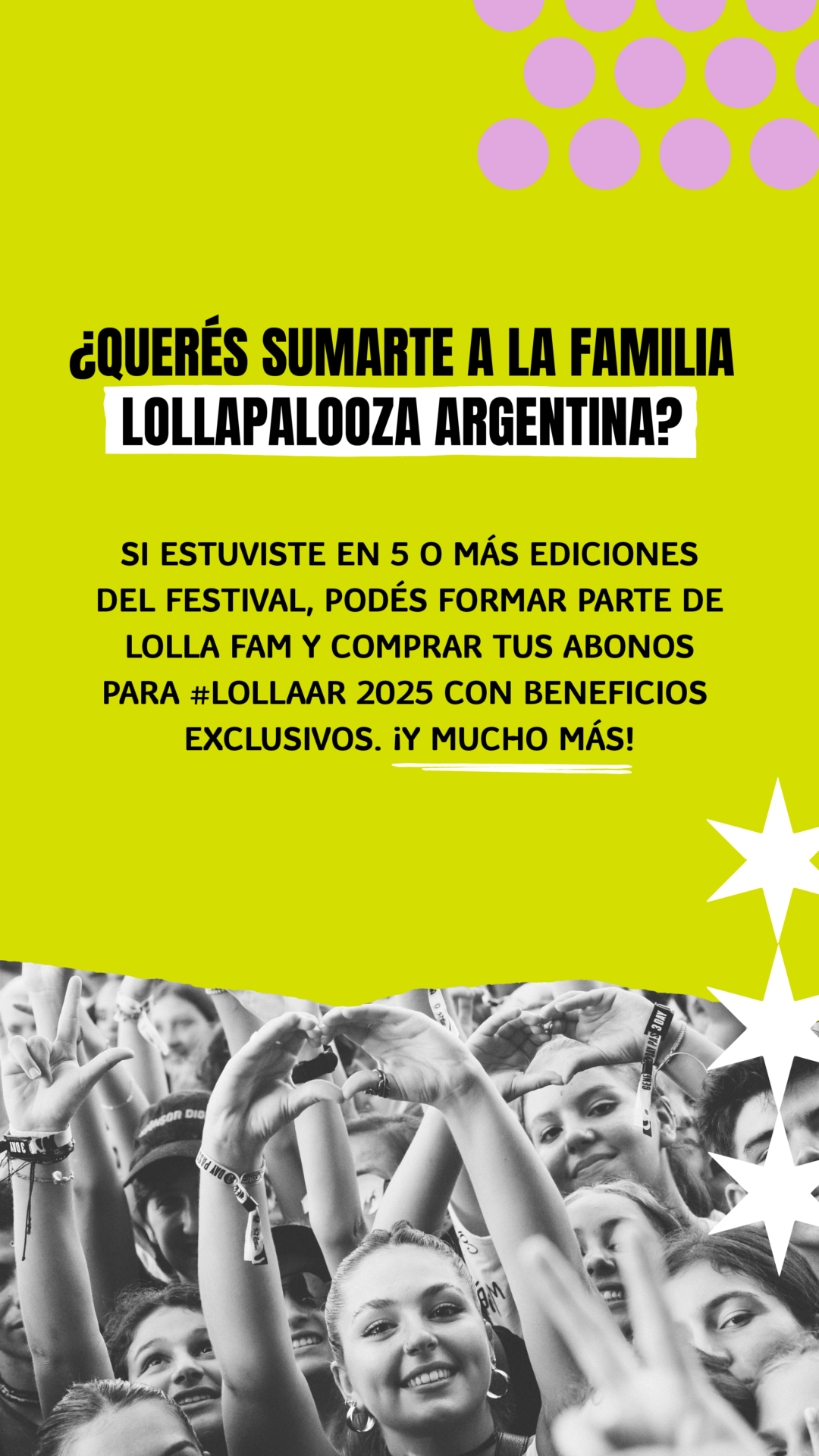 ¿Qué es Lolla FAM? Es una comunidad integrada por quienes hayan concurrido a cinco o más ediciones de Lollapalooza Argentina, la cual, entre otros beneficios, permitirá que sus integrantes accedan a una compra preferencia a precio Early Bird de los abonos para el Lollapalooza Argentina 2025.
