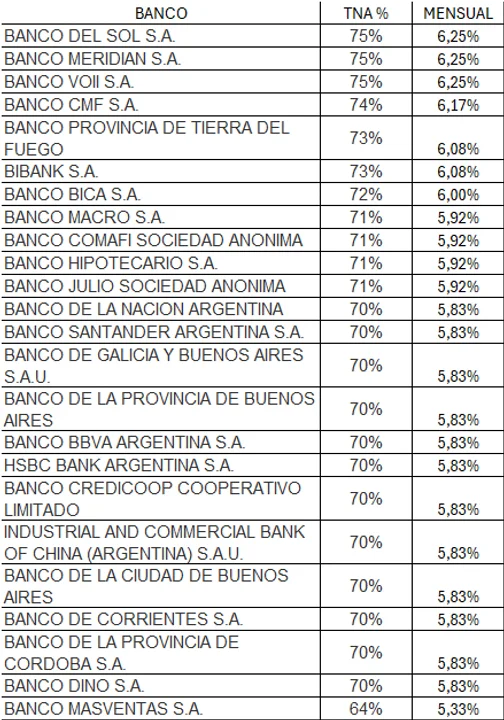 Pero hay algunos bancos que pagan una tasa un poco mejor que otros. Por ejemplo, según la información que recopila el Banco Central de la República Argentina, el Banco del Sol paga una tasa de interés anual de 75%, al igual que el Banco Meridian. En tanto el Banco CMF paga 74% y el de Tierra del Fuego 73%.
