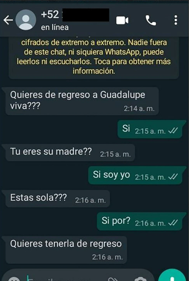 “Quieres de regreso a Guadalupe viva???”, preguntaron en los textos que se hicieron llegar al celular de la mujer, dando a entender que tenían a la menor desaparecida. Además, a media mañana un llamado de otro teléfono desconocido llegó al mismo celular de la madre. Yamila asegura que de fondo se escuchó la voz de su hija, aunque esta versión tampoco pudo ser verificada todavía por los investigadores.