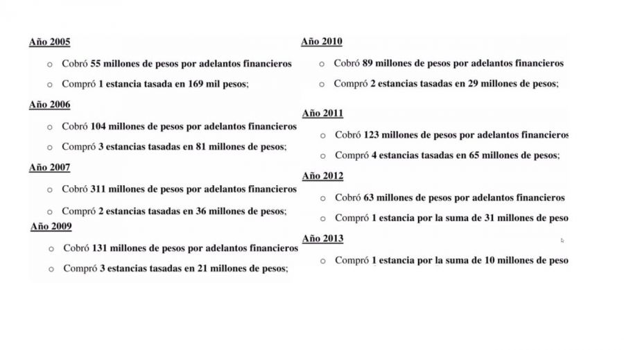 En esta etapa de su alocución, el fiscal mostró un estudio que hizo la Fiscalía donde se compararon los millonarios fondos que recibió Báez en concepto de adelantos financieros. Si bien ese concepto legalmente busca adelantar las obras en ejecución, el fiscal mostró cómo año por año el empresario de Santa Cruz se hizo de estancias por una cantidad innumerable de hectáreas.