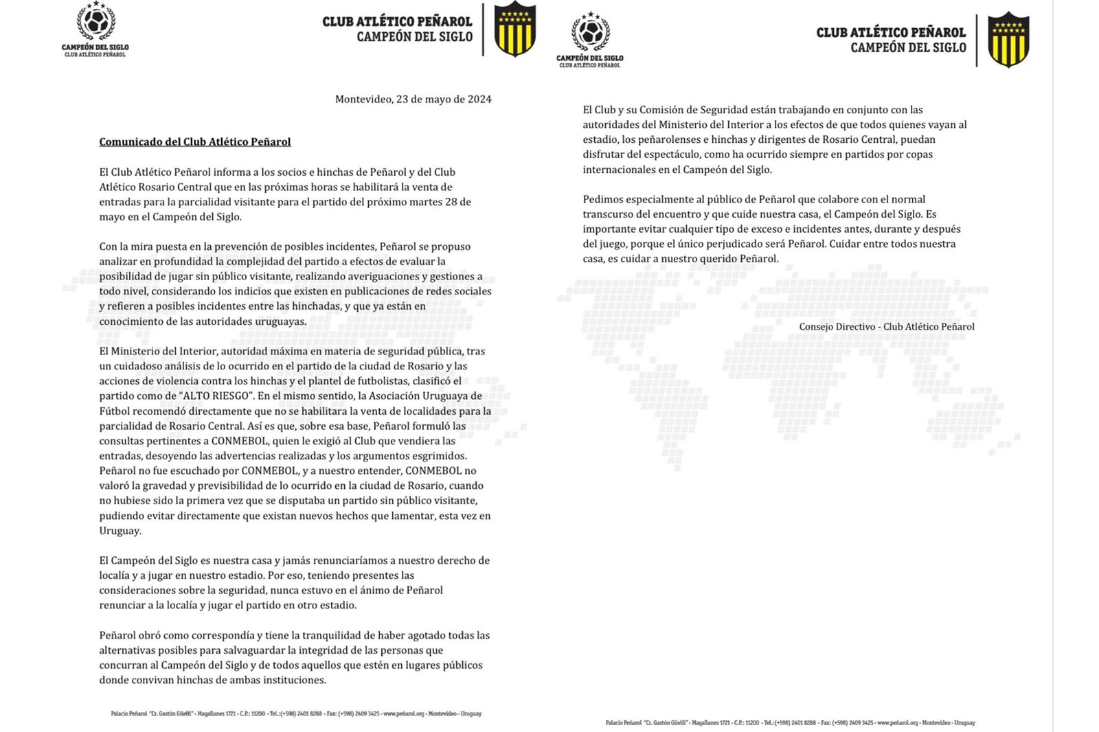 A su vez, en un comunicado, el conjunto uruguayo informó que había planteado a la CONMEBOl, el ente organizador del certamen continental la posibilidad de que el partido se desarrolle sin público visitante. “Peñarol no fue escuchado por Conmebol y, a nuestro entender, Conmebol no valoró la gravedad y previsibilidad de lo ocurrido en la ciudad de Rosario, cuando no hubiese sido la primera vez que se disputaba un partido sin público visitante, pudiendo evitar directamente que existan nuevos hechos que lamentar, esta vez en Uruguay”, advirtieron desde el club carbonero.