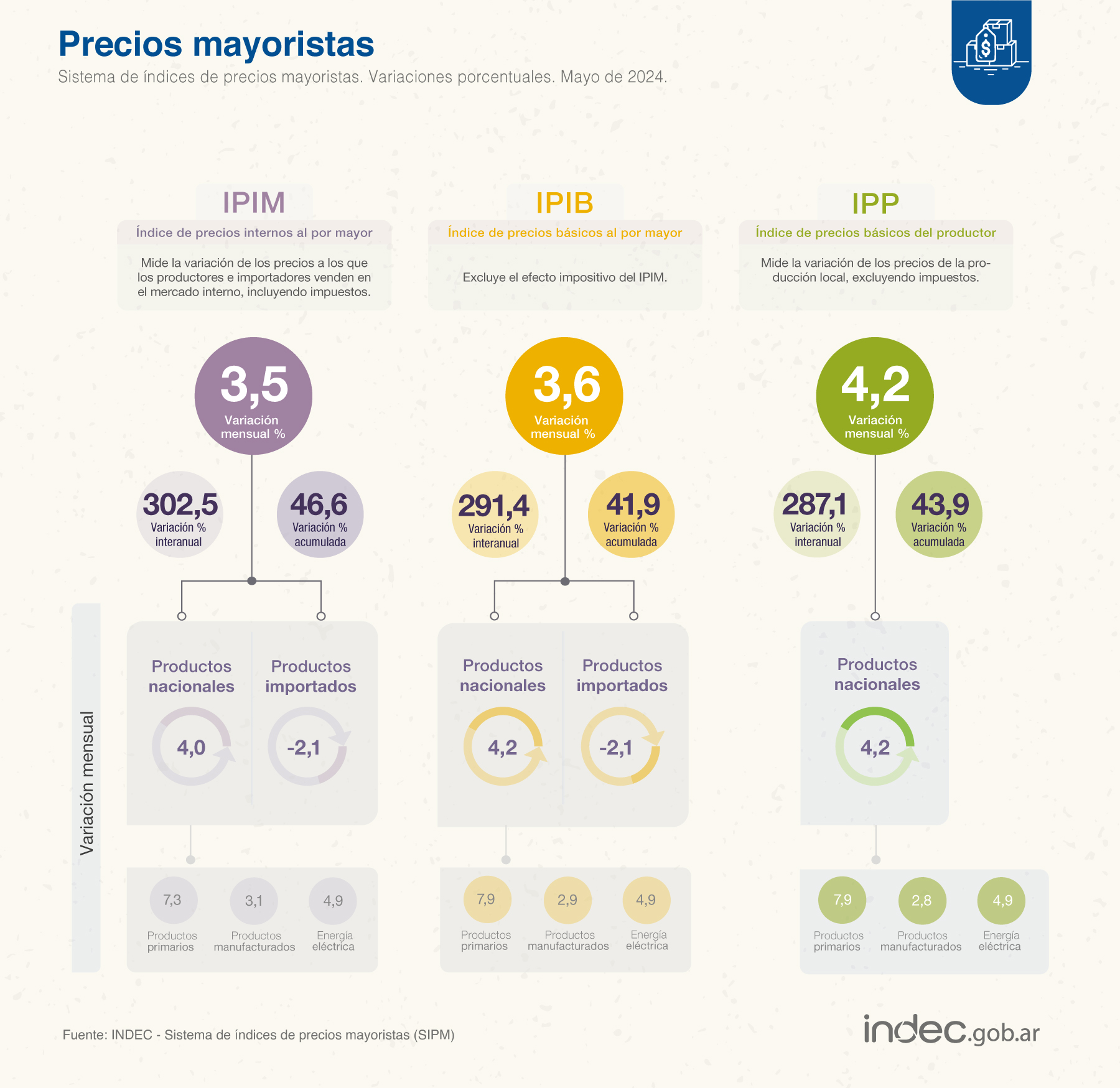 El Instituto Nacional de Estadística y Censo (Indec) informó este martes que el índice de precios mayorista registro un incremento del 3,5% en mayo. Esta variación es consecuencia de la suba de 4,0% en los “Productos nacionales”, compensado parcialmente por la disminución de 2,1% en los “Productos importados”.