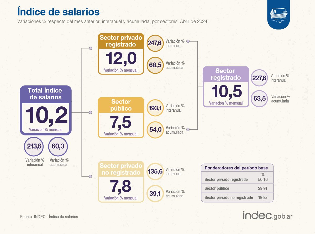 El dato está en línea con lo que el Gobierno nacional había anticipado con el RIPTE, otra de las mediciones salariales que se realizan en la Argentina No obstante, en términos de comparación interanual, y acumulado en 2024 los salarios aún corren de atrás.