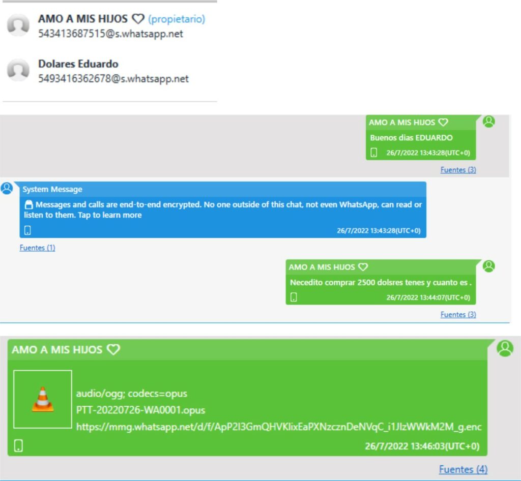 Una de las evidencias presentadas. Chat entre Sandra Calegari, de Los Monos, con el cuevero.