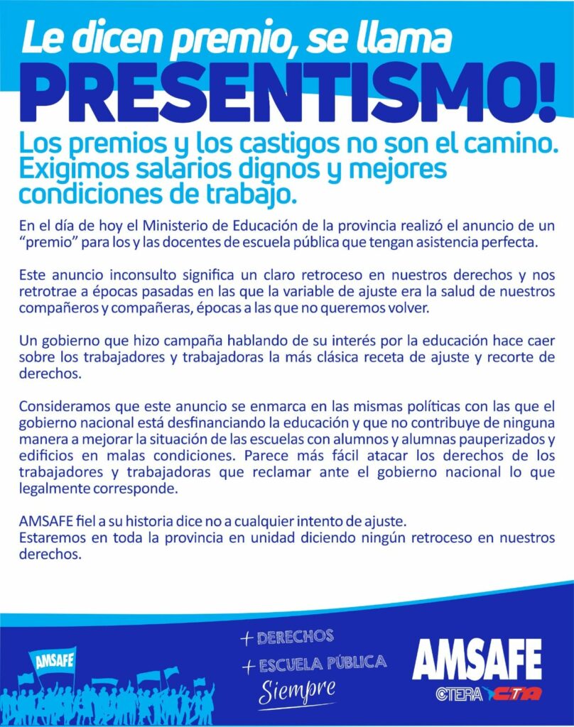 Tras el anuncio del Gobierno de Santa Fe de otorgar un reconocimiento económico a los docentes de la provincia que no falten a las escuelas, los gremios Amsafe y Sadop respondieron expresando sus inconformidades: “Le dicen premio, se llama presentismo”.