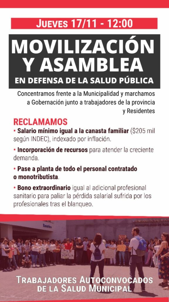 Según indicaron, el reclamo será “en defensa de la salud pública”, por lo que “los trabajadores realizaremos una asamblea y marcharemos a Gobernación junto a trabajadores de la provincia y residentes”.