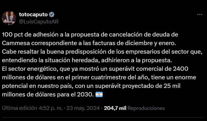La noticia la confirmó el ministro de Economía en la red social X, donde señaló que existe un “100 % de adhesión a la propuesta de cancelación de deuda de Cammesa correspondiente a las facturas de diciembre y enero”.