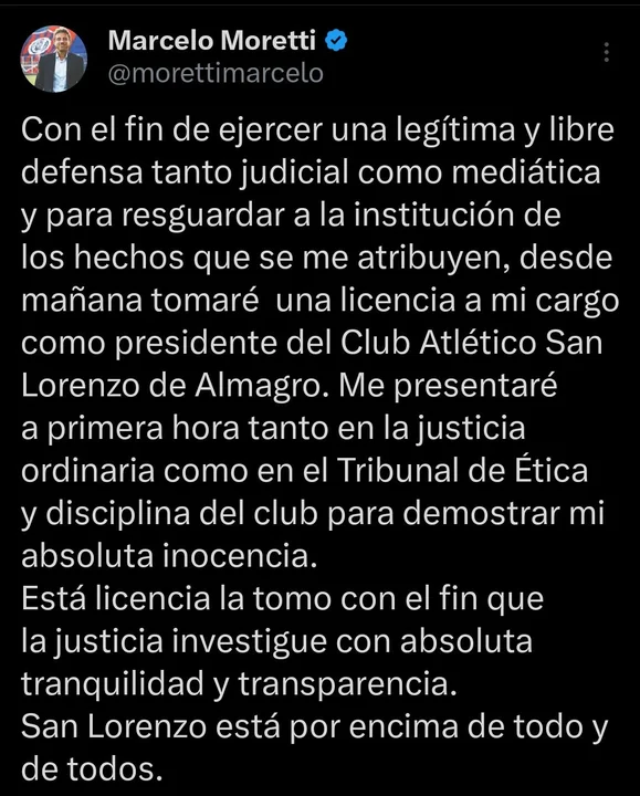 En un comunicado publicado en redes sociales, Moretti expresó: “Con el fin de ejercer una legítima y libre defensa tanto judicial como mediática y para resguardar a la institución de los hechos que se me atribuyen, desde mañana tomaré una licencia a mi cargo como presidente del Club Atlético San Lorenzo de Almagro”. Además, indicó que se presentará “tanto en la justicia ordinaria como en el Tribunal de Ética y Disciplina del club”.