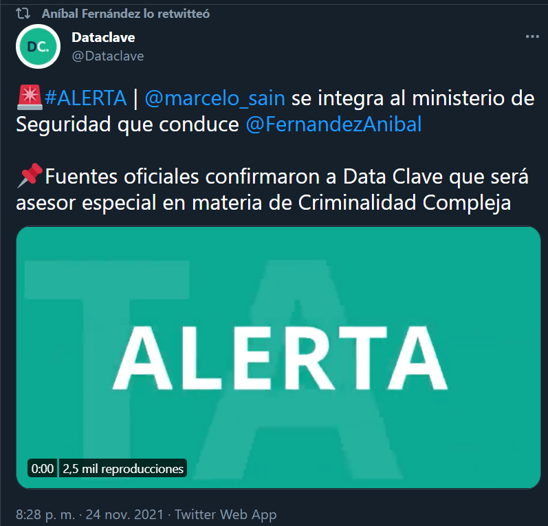 “La Sesión Conjunta removió a Marcelo Sain del cargo de Director Provincial de Investigaciones del MPA y lo inhabilitó por 10 años”, expresó a través de Twitter la Cámara de Senadores de la Provincia el pasado 4 de noviembre.