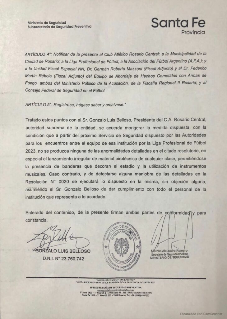 De esta forma, el club de Arroyito podrá colgar banderas y llevar instrumentos de percusión a los partidos de local que serán ante Platense, este domingo a las 14hs por la fecha 15 y ante Defensa y Justicia por la jornada 17 con horario a confirmar.