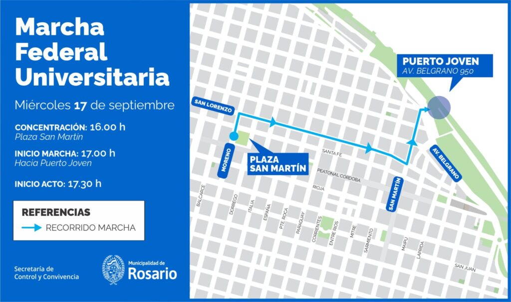 La Municipalidad de Rosario, a través de la Secretaría de Control y Convivencia Ciudadana, anunció desvíos y cortes de tránsito en el centro de Rosario este miércoles 17 de septiembre, con motivo de la realización de la Marcha Federal Universitaria.