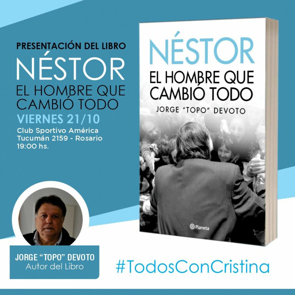 El diputado nacional Marcos Cleri y el autor de la obra, Jorge Topo Devoto, encabezarán este viernes en Rosario el cierre del ciclo de presentaciones en la provincia de Santa Fe del libro “Néstor. El hombre que cambió todo”. “Vamos a realizar un gran acto para ratificar nuestro compromiso con la patria justa, libre y soberana por la que él tanto luchó”, adelantó Marcos Cleri, respecto del encuentro previsto para las 19 en la sede del club Sportivo América de calle Tucumán entre bulevar Oroño y Balcarce.