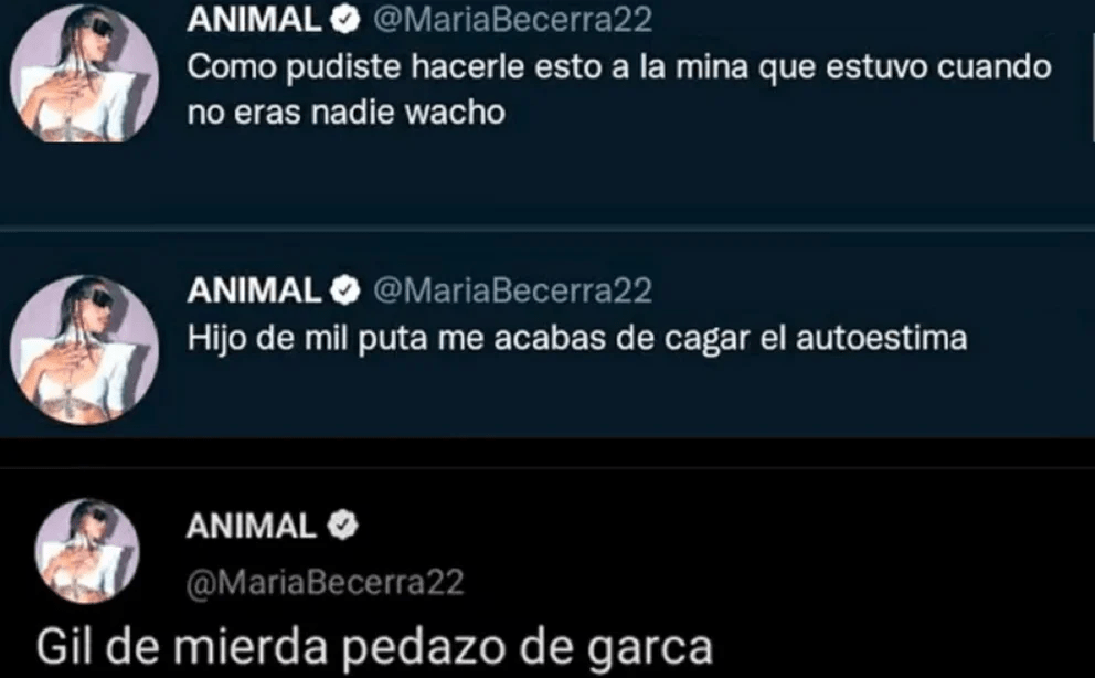 “Hijo de re mil p… me acabas de cagar la autoestima”, “Cómo pudiste hacerle esto a la mina que estuvo cuando no eras nadie wacho”, “Gil de m… pedazo de garca”, fueron algunos de los mensajes que publicó la música de 21 años en su cuenta de Twitter. Sin embargo, minutos más tarde los eliminó. Además, ambos dejaron de seguirse en esa red social.