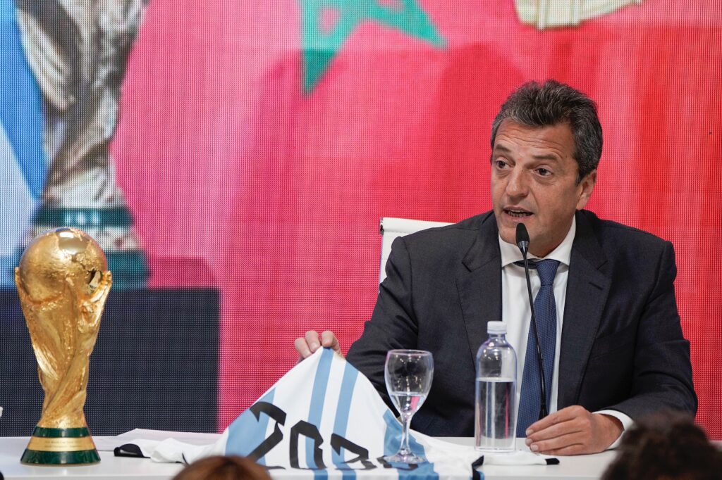 “Lo primero que se viene es orgullo enorme por el fútbol argentino. Tuve la oportunidad de trabajar, recorrer, intercambiar con actores económicos, políticos, financieros de cada rincón del mundo y les puedo asegurar que si hay una cosa que nos identifica, construye una marca y permite acercar cualquier diferencia es esta camiseta, la celeste y blanca”, manifestó Massa en el predio de la AFA.