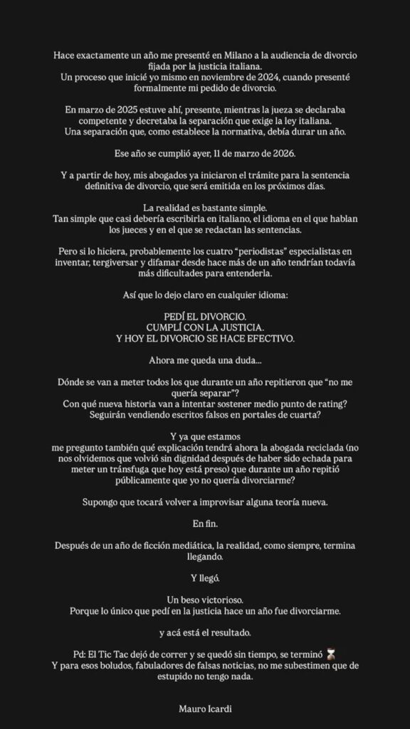 El futbolista argentino Mauro Icardi rompió el silencio tras confirmarse su divorcio de Wanda Nara y publicó un fuerte descargo en redes sociales en el que se refirió al proceso judicial que puso fin a su matrimonio.