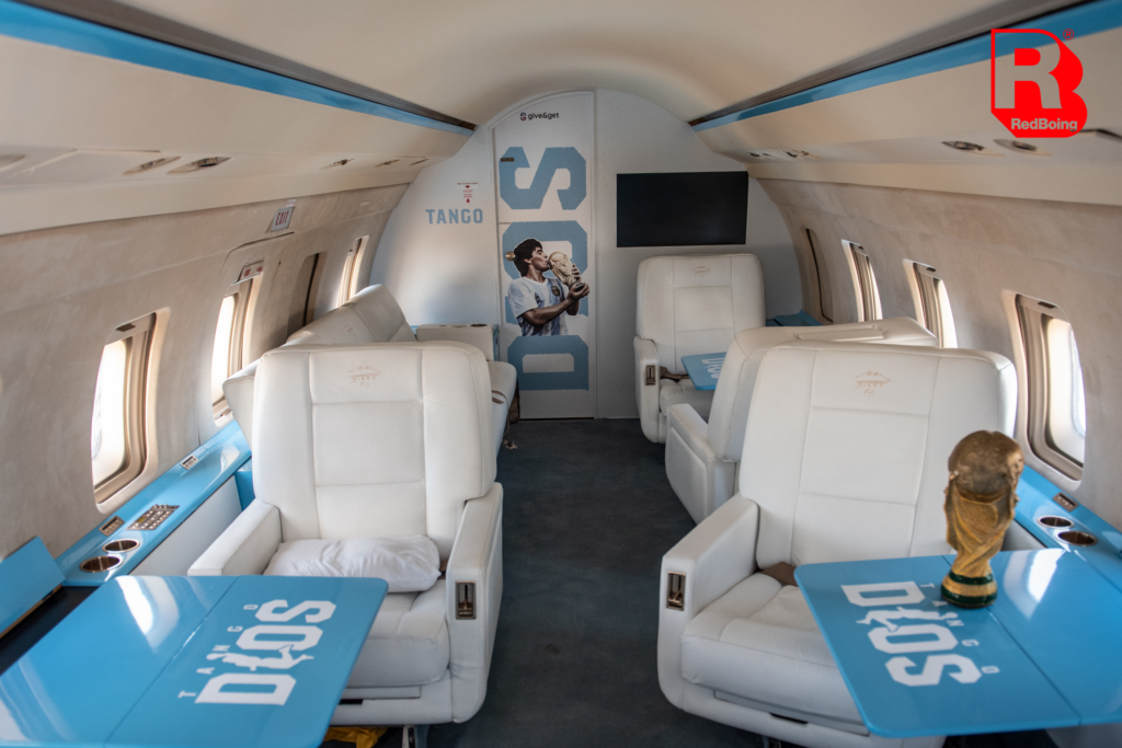 El museo itinerante se trata de un avión privado, con una capacidad máxima de diez personas, que tiene como destino final la Copa del Mundo que se disputará desde noviembre en Qatar. Además, en las instalaciones del Aeropuerto donde se encuentre, los visitantes podrán dejar un mensaje grabado a Maradona, y mediante un dispositivo de tecnología, preguntarle cosas y hablar con Pelusa.
