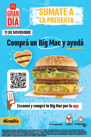 El viernes 11 de noviembre McDonald’s llevará a cabo una nueva edición del Gran Día, su jornada solidaria más importante del año donde el 100% de lo recaudado por la venta del sándwich Big Mac en todo el país será donado a Fundación Sí y a la Casa Ronald.