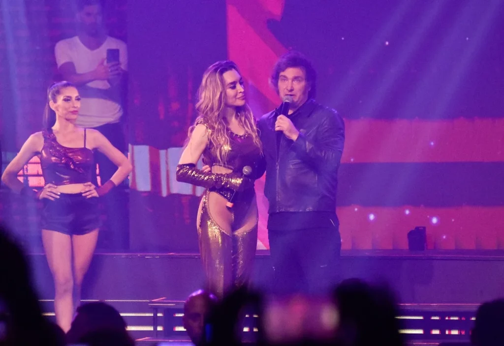 Igual que la primer vez que asistió, Milei subió al escenario al finalizar la función y cuando acercaron a la actriz una torta para apagar las velitas en el día de su cumpleaños.