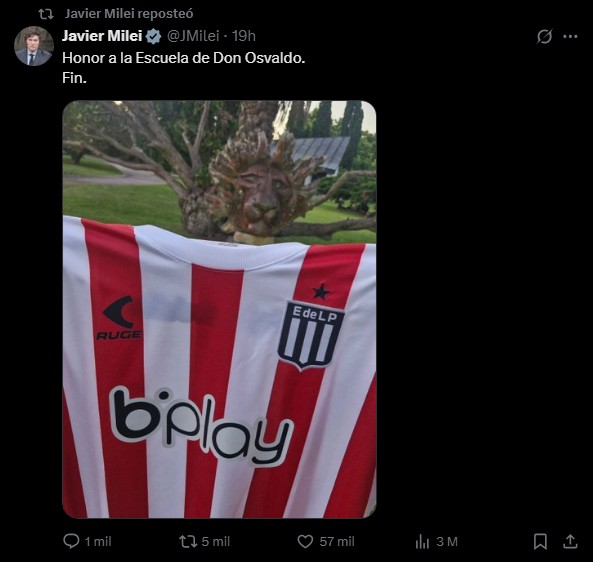 El mandatario publicó en su cuenta de X una foto de la camiseta del “Pincha” junto al mensaje “Honor a la Escuela de Don Osvaldo. Fin”, en referencia al histórico entrenador Osvaldo Zubeldía, figura insignia de la identidad competitiva del club. Sin embargo, el guiño no quedó solo en las redes: Milei también exhibió camisetas de Estudiantes durante una reunión con funcionarios israelíes en Casa Rosada, reforzando su apoyo en un espacio institucional y diplomático.