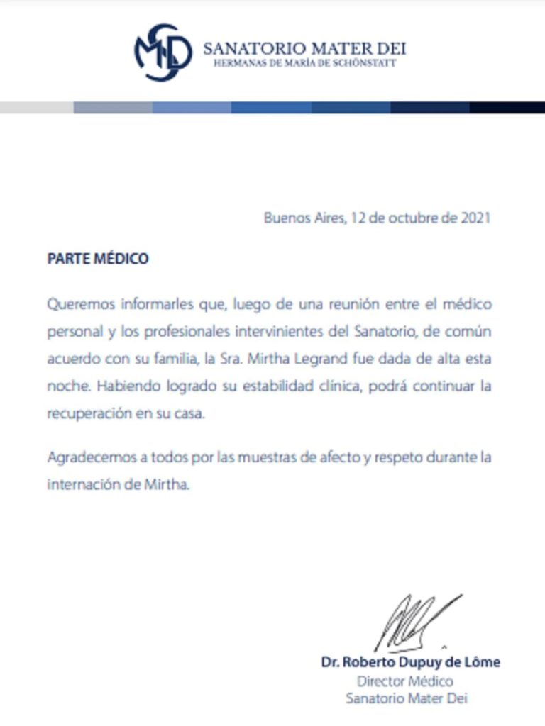 “Queremos informarles que, luego de una reunión entre el médico personal y los profesionales intervinientes del sanatorio, de común acuerdo con su familia, la señora Mirtha Legrand fue dada de alta esta noche”, comienza el parte médico del centro de salud Mater Dei.